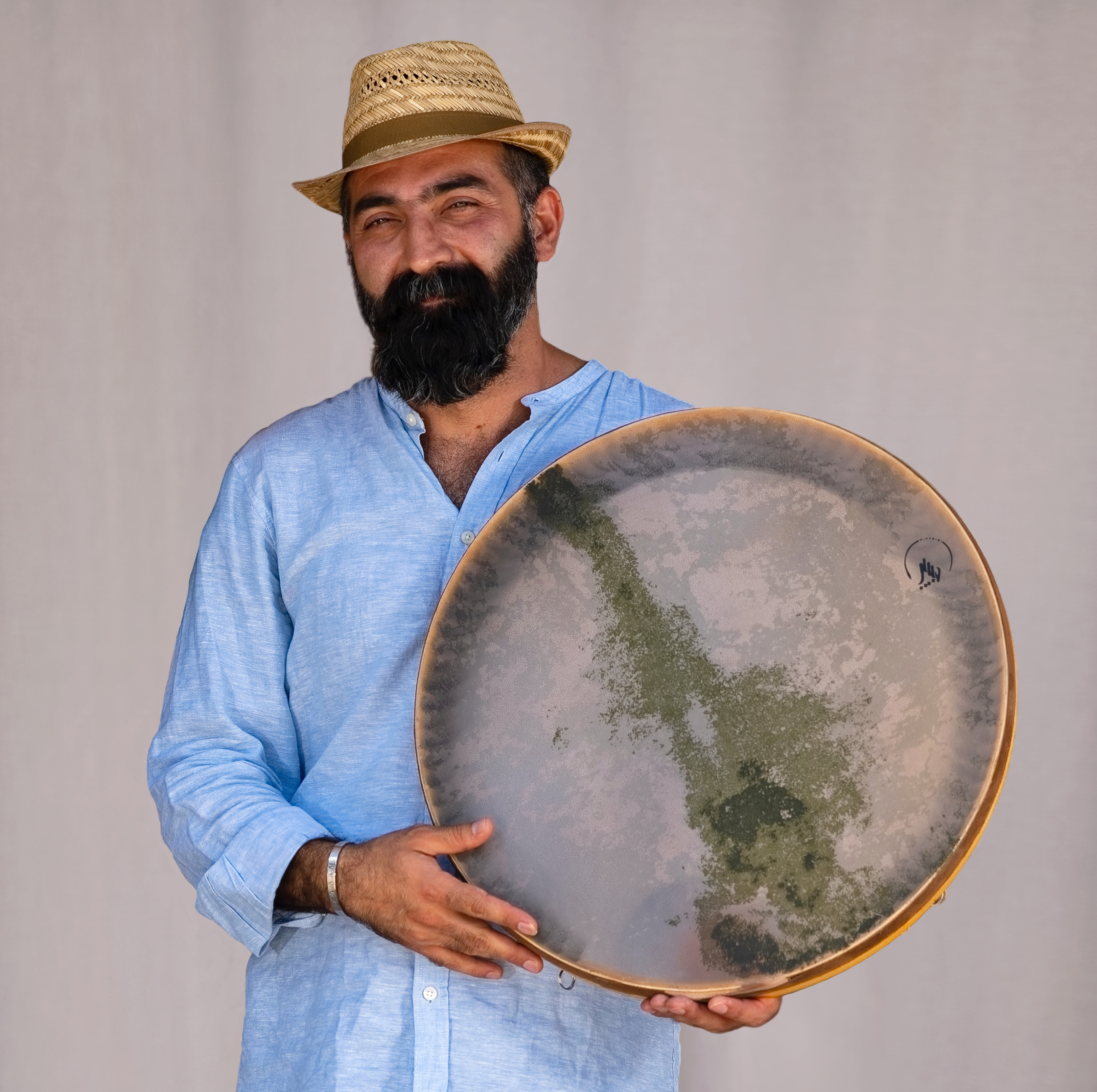 Aux percussions, Ebrahim Ahmadi est un joueur kurde iranien de daf, dayereh, dahol (tambours traditionnels) et setar (luth à 3 cordes). Né dans la province du Kermanshah durant la guerre entre l’Iran… (+)